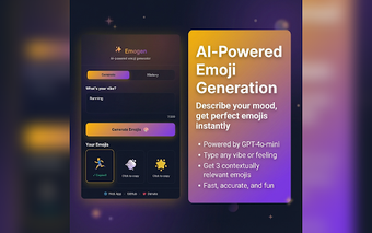 Emogen is een handige browserextensie die gebruikers in staat stelt om op basis van hun stemming of vibe de perfecte emoji's te genereren. Deze gratis tool, beschikbaar voor Chrome, maakt gebruik van geavanceerde AI-technologie om contextueel relevante emoji-combinaties te creëren. Met een gebruiksvriendelijke interface kunnen gebruikers eenvoudig hun emoties invoeren en met één klik de gewenste emoji's kopiëren naar het klembord. De extensie biedt ook een emoji-toetsenbord met de laatste 16 gegenereerde emoji's in een overzichtelijke 4×4 rasterindeling.
